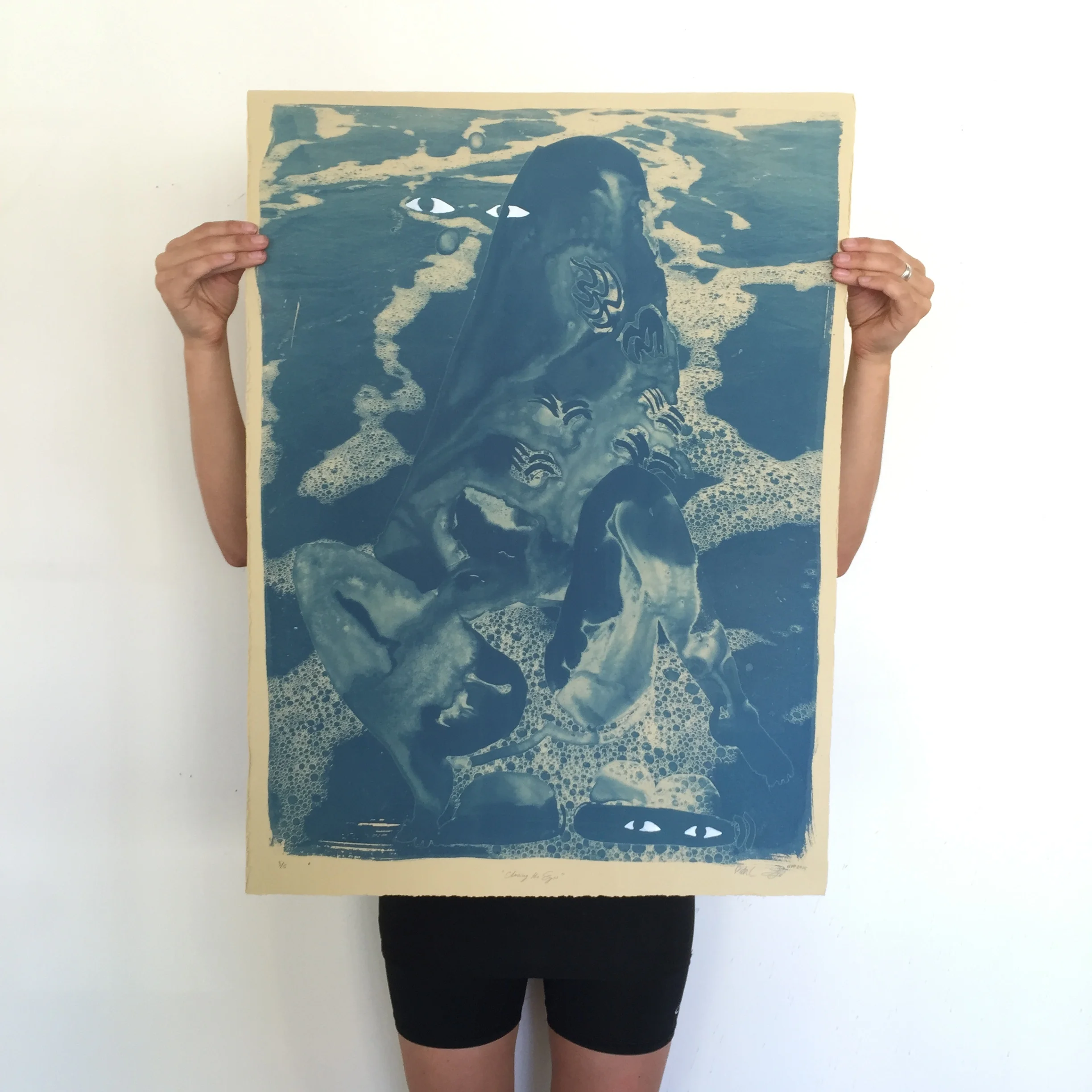 Part of a series of cyanotype prints called 'Bodies of Water' which uses runny ink drawings and photography to unveil the ways that water shapes our mental and material landscapes. Each print in the series is editioned to 5 and has a hand-painted gauche highlight on top.